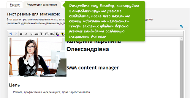 Перейдите на страницу кандидата и в правом верхнем углу выберите опцию «Редактировать карточку кандидата». Пролистайте страницу вниз до раздела, где расположен файл с резюме и выберите вкладку «Резюме для заказчиков». По умолчанию в этой вкладке откроется визуальный редактор. Скопируйте резюме кандидата, отредактируйте его — уберите лишнюю информацию и контактные данные, а затем кликните на кнопку «Сохранить изменения». Теперь заказчик увидит версию резюме, которую вы создали специально для него.