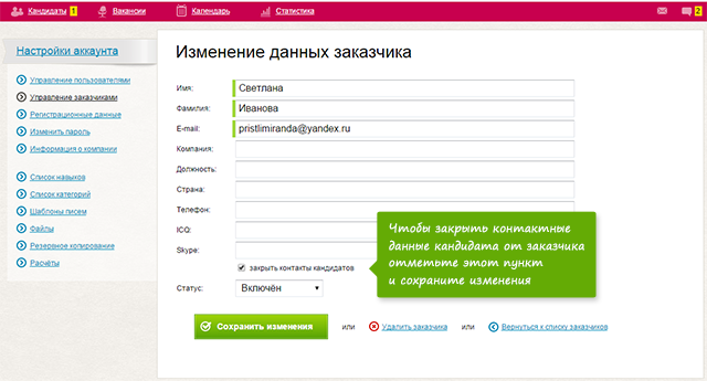 В настойках аккаунта перейдите в раздел «Управление заказчиками» и выберите опцию «Изменение данных заказчика». Под данными клиента вы увидите графу «Закрыть контакты кандидатов». Отметьте этот пункт «галочкой» и сохраните изменения. После этого страница карточки соискателя будет показана заказчику без контактной информации кандидата.