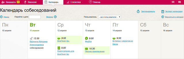 Для того, чтобы вам не нужно было каждый раз проверять календарь и просматривать предстоящие задачи — список ближайших запланированных дел будет отображаться слева на главной странице вашего аккаунта. Также, если вы находитесь на странице карточки кандидата, то здесь же можете видеть задачи, связанные с этим соискателем.