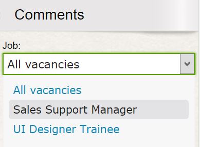 Surely, you are familiar with situation when one candidate is considered for several similar positions. In PersiaHR you can link one resume to several jobs. In applicant’s card on the left you can see comments to the resume that you, your colleagues and customers have left. Now this information can be filtered by job. To do this, use the drop-down list of jobs in Comments field.
