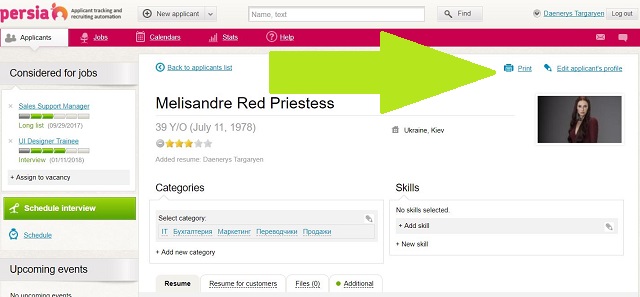 We have improved the ability to print applicant’s card. Now the paper version will include contact information, lists of skills and categories, as well as the resume text. To do this, you need to use Print button in the upper right corner.