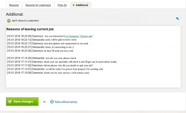 To make a note go to the applicant’s card, then go to editing mode and open Additional tab. Here you can see a field for entries where you can write a note or comment, save the history of correspondence from the messenger, enter questionnaire answers and specify any other important information. After you have created the note, click Save Changes button. Additional tab will now be highlighted in green. At any time, this information can be edited.