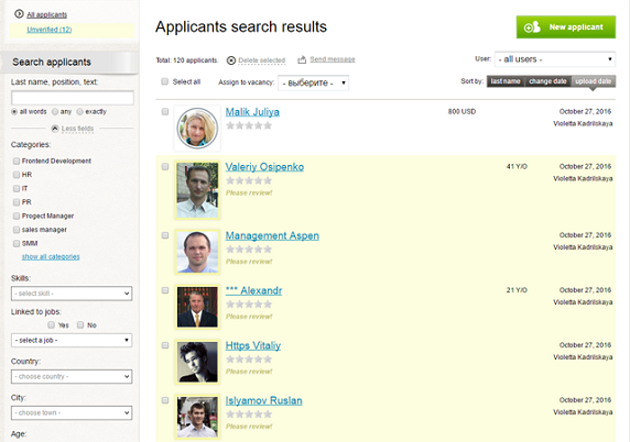 We have also improved the keyword search option. As before, you can choose the appropriate search mode “all words”, “any” or “accurate”, but now the system will give you the result in such an order — name, CV, comments on the CV and history.