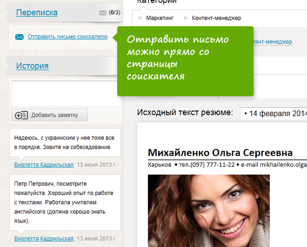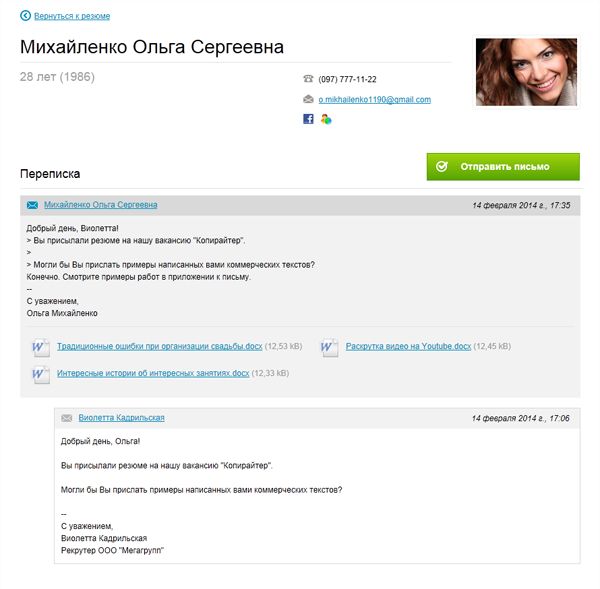 На странице каждого кандидата появился раздел «Переписка». Копии писем от кандидатов также приходят и на ваш основной почтовый ящик.