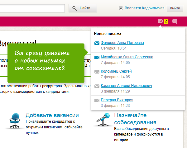 Когда соискатель отвечает на ваше письмо, вы получите его не только в свой основной почтовый ящик, но и увидите его в «Персии».